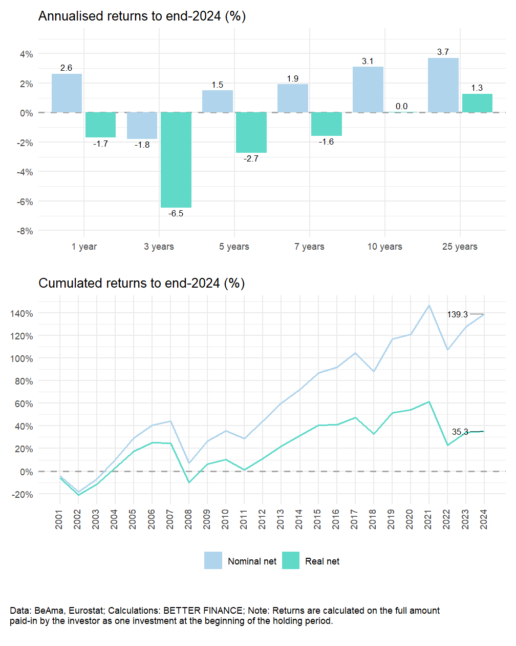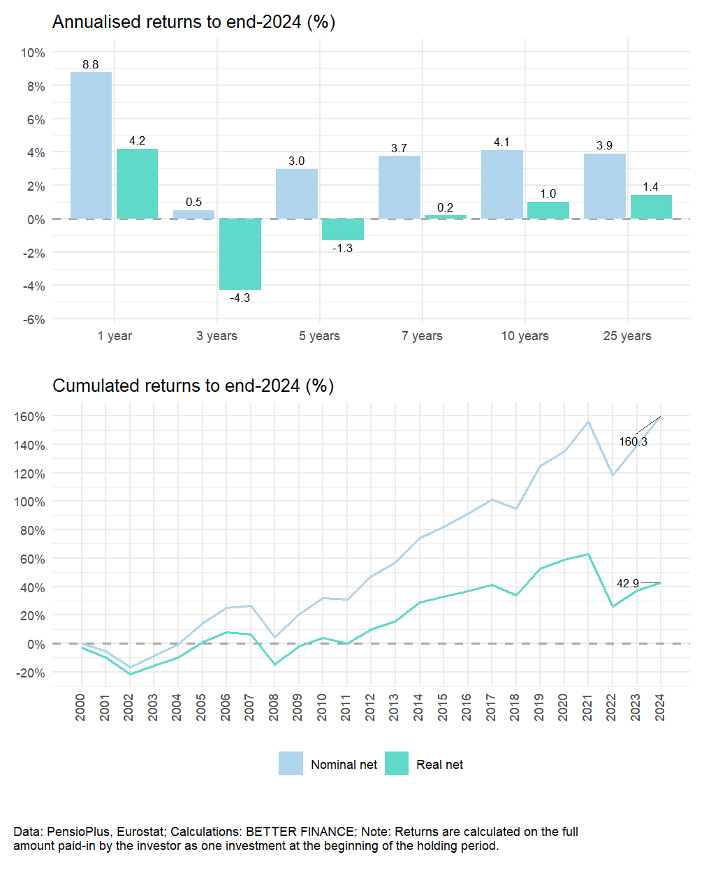 Over a 25-year period (2000-2024), occupational pension plans managed by IORPs experienced negative nominal returns before charges five times: in 2001, 2002, 2008, 2018 and in 2022. Over this time-period, their annualised nominal and real net returns are positive, respectively 3.9% and 1.4%.