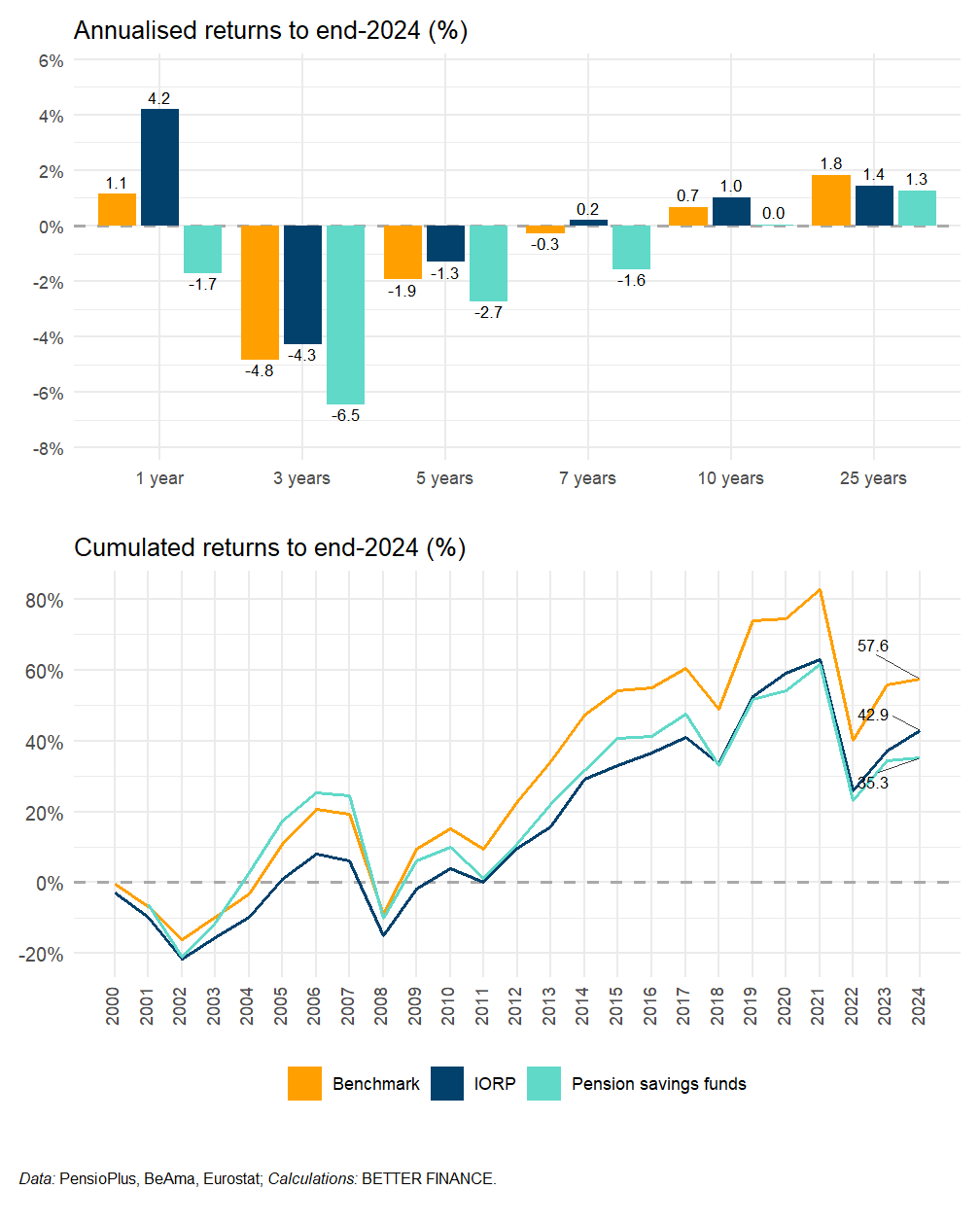 Over a 25-year period (2000-2024), occupational pension funds managed by IORPs (pillar II) and pension savings funds (pillar III) have an annualised real performance after charges of 1.4% and 0.9% respectively.