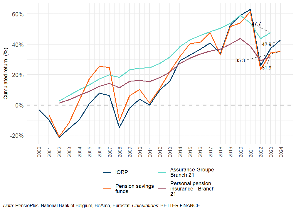 The Belgian Asset Managers Association (BEAMA) provides quarterly data on pension savings funds. The most recent data regarding their returns was on an annual basis at end-2024. These average returns were calculated based on the average returns of all available funds in the market, after expenses but before taxation and inflation.