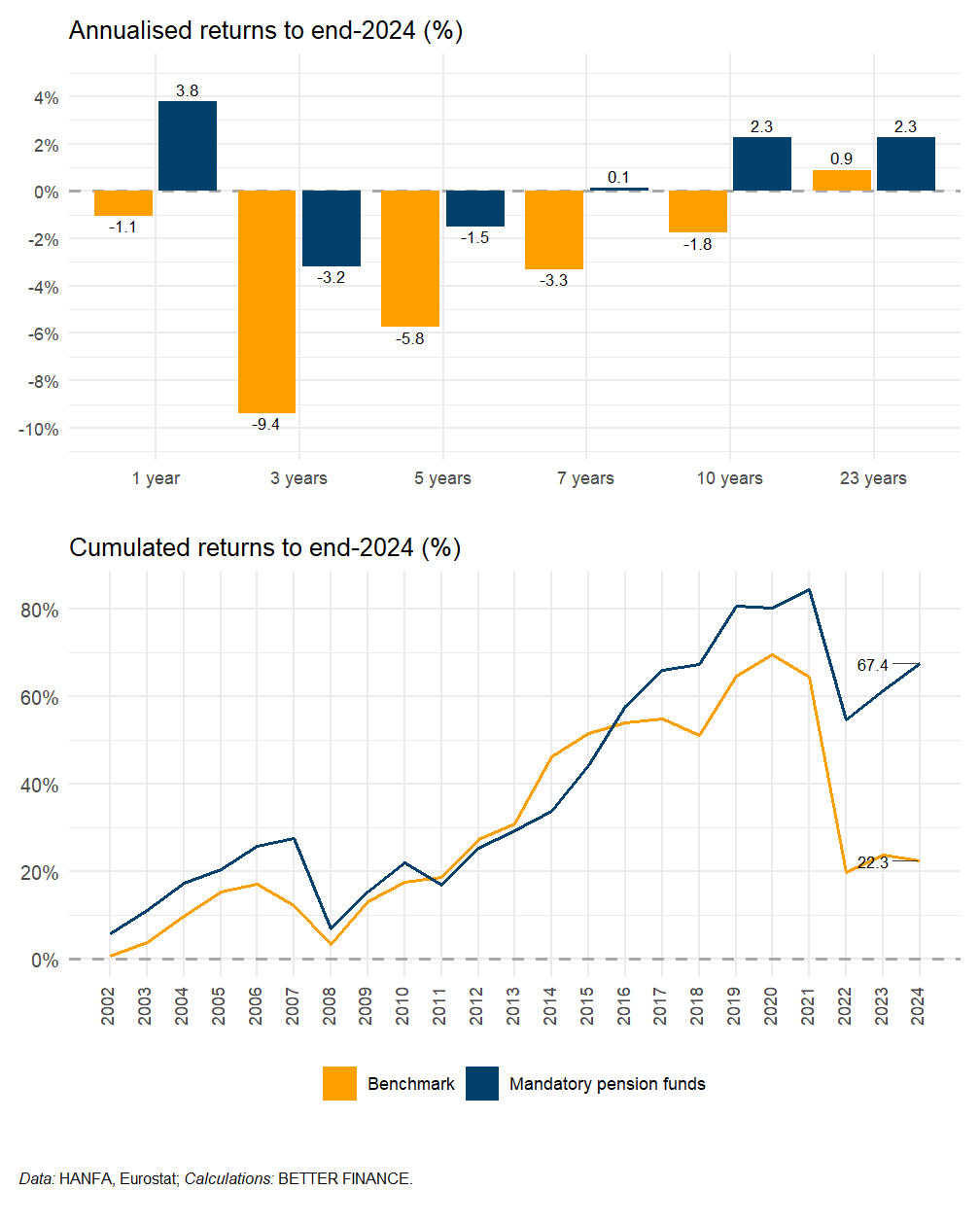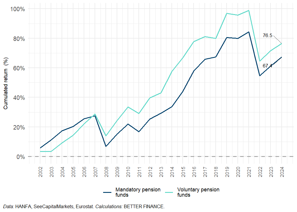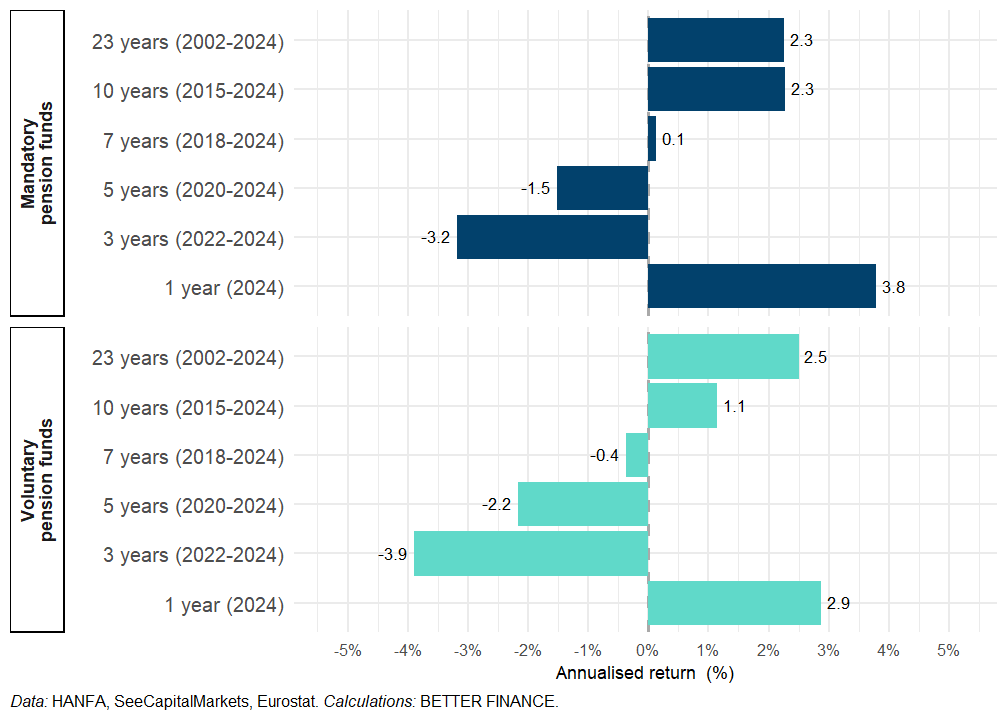 The performance of private pensions (mandatory as well as voluntary) was positive in 2024 both in nominal and real terms mainly due to the pick-up of the world markets and decreasing inflation.