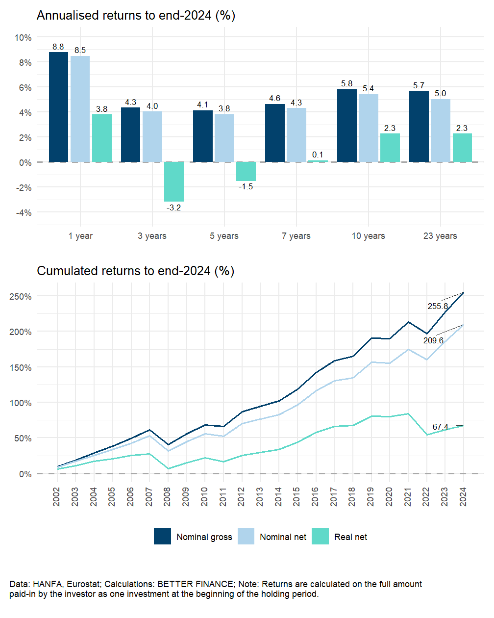 Overall, the real net returns of pension vehicles was positive in 2024. If the entire analysed period is considered, the annualized returns are in positive territory both for Pillar II as well as Pillar III products especially due to the positive returns during last years.